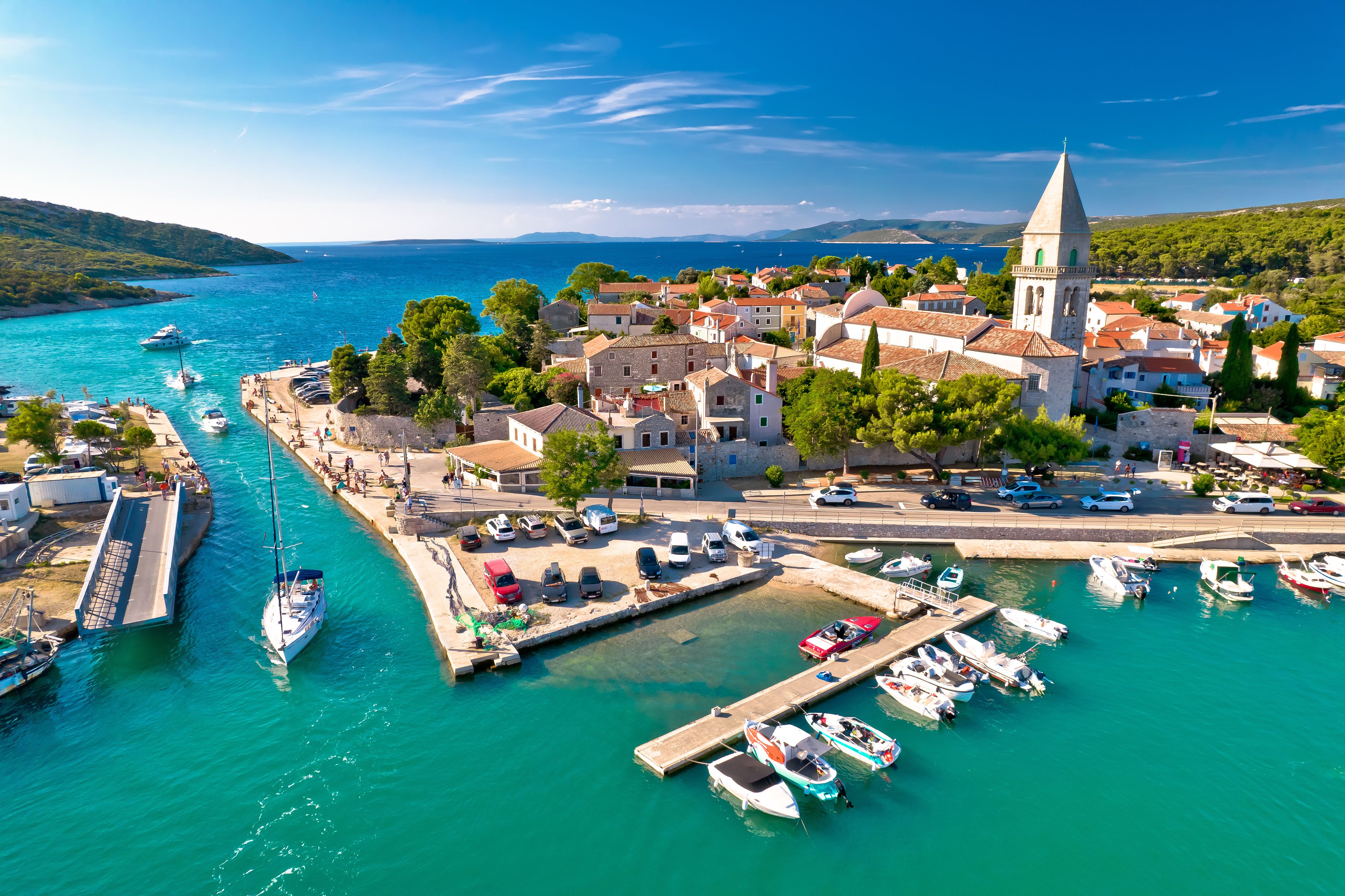 Aerial view of boats sailing through a narrow channel between two islands in Croatia, with Osor town on the right