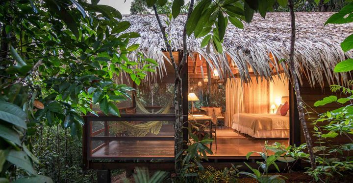 Accommodation comes in three categories: cottages, bungalows and panoramic. If you want to go all out, choose the latter. The panoramic rooms have enormous decking areas and floor-to-ceiling windows, all to ensure you don’t miss that jaguar slinking past your room. Food is delicious, beautiful and locally sourced – think delicate pastries made with Brazil nuts and ceviche made with fish plucked from the Rio Negro.